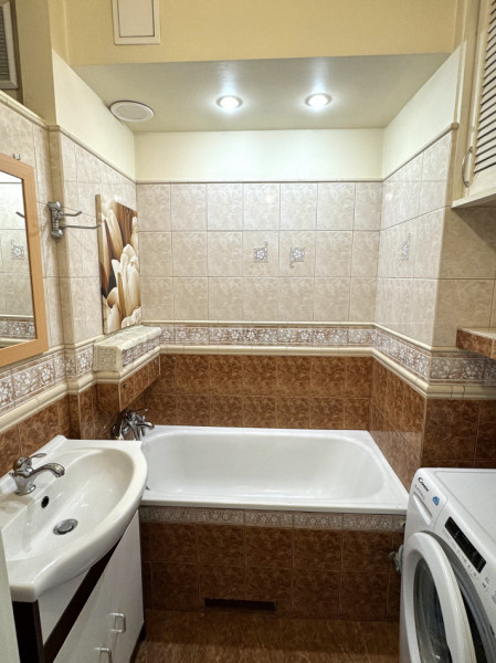 Wygodna łazienka z wanną, umywalką z szafką oraz pralką.