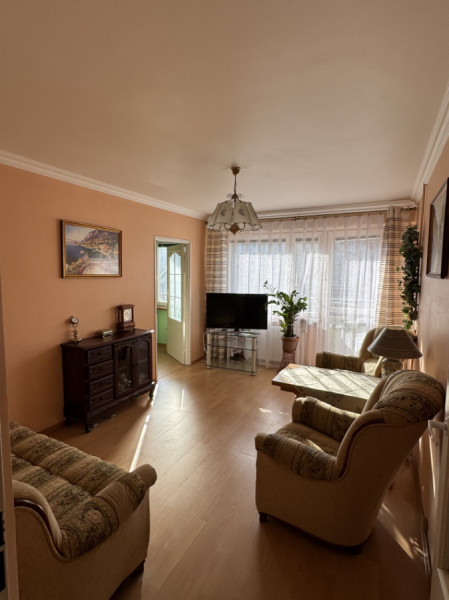 Jasny i przestronny, wyposażony w telewizor, fotele, rozkładaną sofę z funkcją spania oraz komodę.