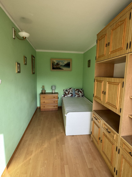 Ustawny, jasny pokój z wygodnym łóżkiem, komodą oraz szafami z dużą ilością miejsca do przechowywania. Dodatkowo półki na książki.