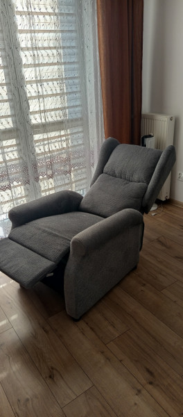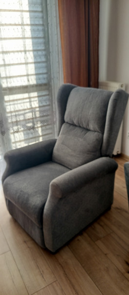 Wygodny fotel wypoczynkowy w kolorze popielatym. Posiada regulowane oparcie, dzięki czemu można dopasować jego ustawienie do własnych potrzeb. Fotel jest w bardzo dobrym stanie. Miękkie, głębokie siedzisko i wysokie oparcie możliwość rozłożenia. Tapicerka z tkaniny, wygodny i łatwy w utrzymaniu czystości, idealny do salonu.