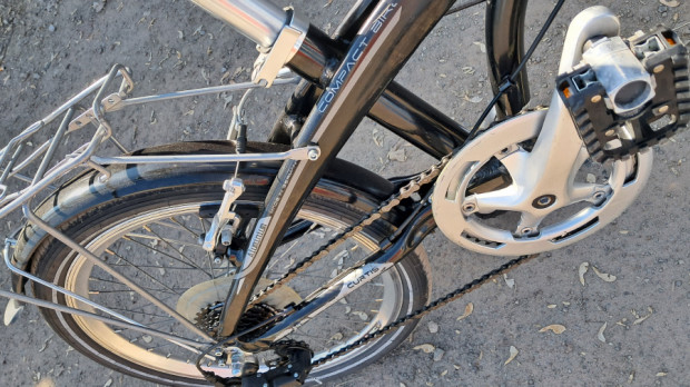 Rama i konstrukcja: Rower posiada czarną, aluminiową ramę z charakterystycznym mechanizmem składania w połowie jej długości.