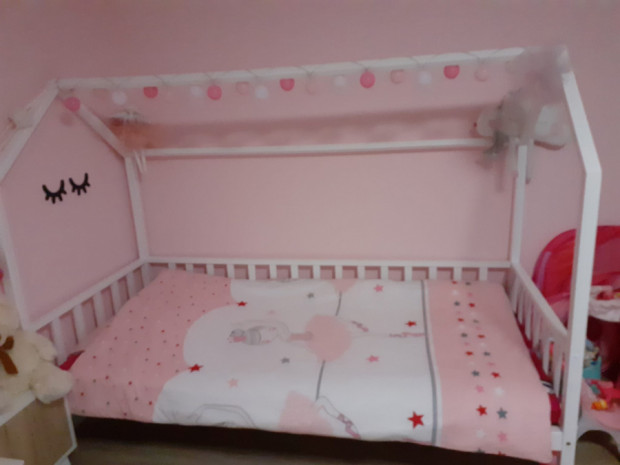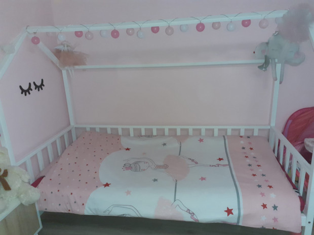 Stylowy, drewniany łóżko domek dla dziewczynki w kolorze białym. Łóżko wykonane z drewna, z barierkami bocznymi zapewniającymi bezpieczeństwo. Idealne do urządzenia przytulnej sypialni dla małej księżniczki.