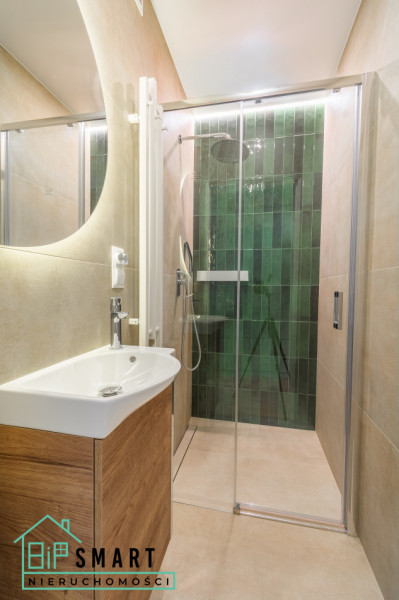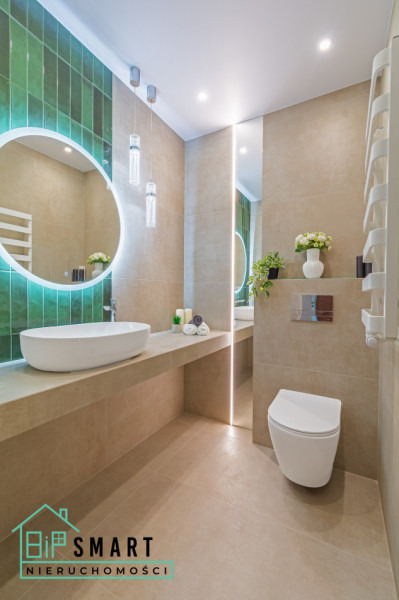 nowoczesnej łazienki z prysznicem oraz osobnej toalety z miejscem na pralkę. Obie przestrzenie zostały urządzone w gustownym, minimalistycznym stylu z nowoczesnym oświetleniem LED i eleganckimi lustrami, które dodają pomieszczeniom uroku.