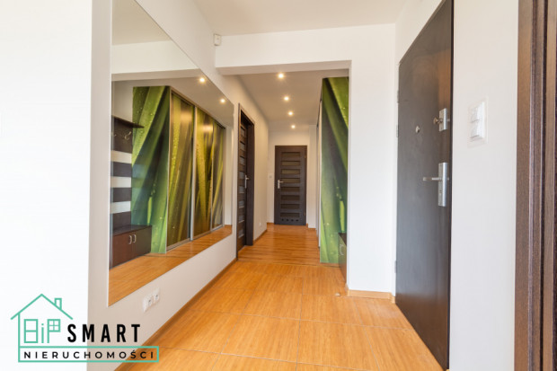 Przestronny korytarz – Z dużą szafą na przechowywanie rzeczy oraz lustrem na całej ścianie, które optycznie powiększa przestrzeń, nadając korytarzowi elegancki i nowoczesny wygląd.