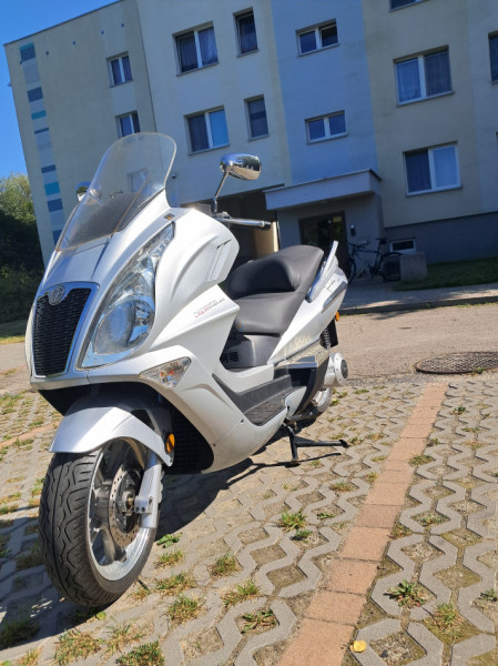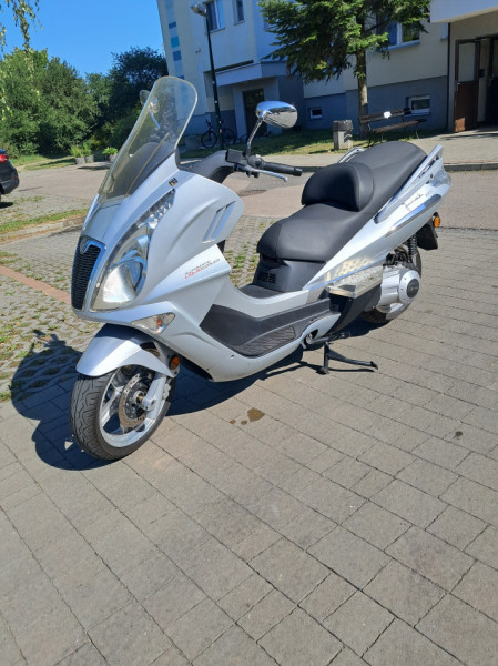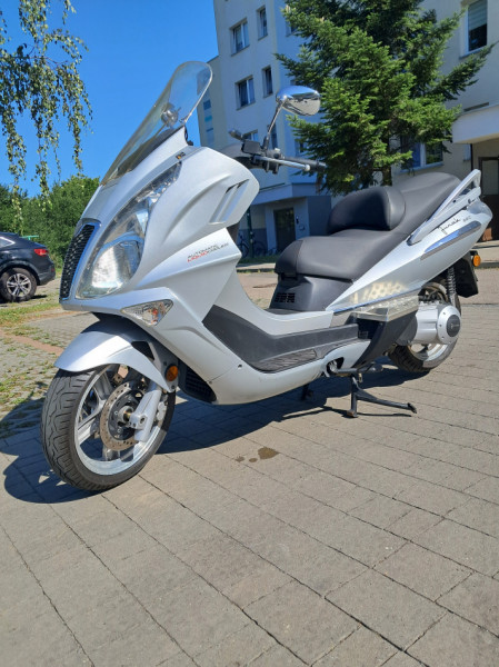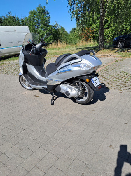 Skuter jeden z największych na rynku. Pojemność 250 cm, czterosuw, chłodzony płynem, prędkość max powyżej 130 km/h. Przebieg 5800 km. Zamontowane fabrycznie radio z 4 głośnikami + usb, nadmucch ciepłego powietrza na kolana. Pojemny schowek na 2 kaski. Rozrusznik elektryczny, skrzynia biegów bezstopniowa. Stan idealny. Aktualne OC i przegląd.